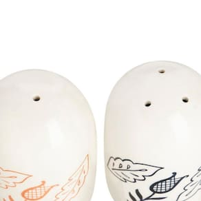 O Jogo de Saleiro e Pimenteiro Costa é produzido em cerâmica. Com formato arredondado, as estampas são inspiradas nas pinturas Ibéricas, trazendo um ar veranil com desenhos de folhagens abstratas. É ideal para servir à mesa e usar para o preparo das refeições. Cada um possui capacidade para 85 g.