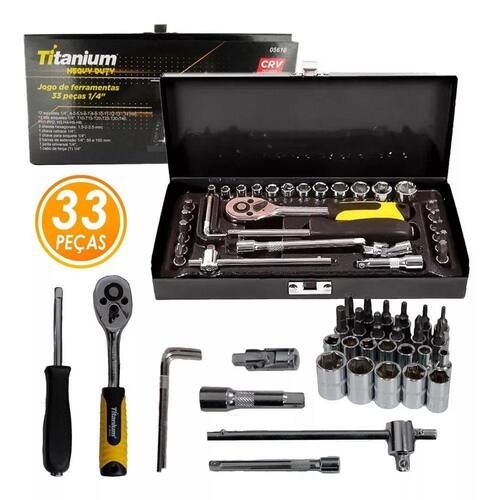 - O jogo de soquetes bits 33 peças Titanium é ideal para diversas aplicações diárias, além de ser extremamente úteis para trabalhos profissionais ou uso convencional na própria residência. - Acompanha estojo de Metal para acomodação e transporte das peças. - Indicado para sempre ter em mãos a ferramenta certa para qualquer ocasião.