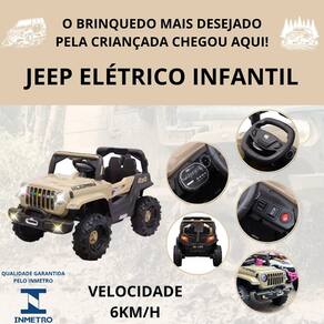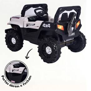 O Jeep possui luzes em led, cinto de segurança, volante com direção hidráulica, pedal de aceleração, controle remoto e painel digital multimídia, com entrada para usb e aux.