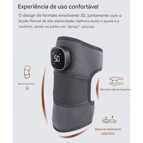 Alívio instantâneo e ajustável para dor no joelho Sinta o alívio que você merece com o massageador de joelho que combina calor, vibração e massagem em um design portátil e fácil de usar. Com cinco níveis de temperatura ajustáveis 40, 45, 50, 55 e 60 e modos de massagem personalizáveis, você experimentará um alívio profundo e duradouro, onde quer que esteja.
