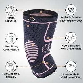 A joelheira de compressão APEXUP Cobre, adequada para homens e mulheres, usa elastano de alto desempenho infundido com cobre para suporte avançado do joelho. As mangas de compressão de joelho masculinas oferecem amortecimento superior, efeitos de descompressão e alívio da dor, melhorando a circulação sanguínea e reduzindo a rigidez. Com uma faixa antiderrapante de silicone, ela permanece firme no lugar durante as atividades. O material respirável e absorvente de umidade evita irritação. É ideal para alívio da dor da artrite, prevenção de rupturas do menisco e redução de danos musculares durante atividades físicas. Para um ajuste ideal, consulte a tabela de tamanhos e mantenha a longevidade apenas lavando à mão