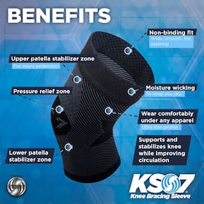 A joelheira de compressão patenteada OrthoSleeve KS7 combina suporte ortopédico de nível médico com o poder da tecnologia de zona de compressão para proporcionar alívio da dor e suporte a pessoas que sofrem de joelho de corredor, dor crônica no joelho, joelhos artríticos inchados, tendinite patelar, síndrome ITB e outras doenças do joelho. O KS7 foi projetado para se ajustar a qualquer formato de perna/joelho com base nas medidas corretas de acordo com nossa tabela de tamanhos. O design moldado para caber oferece uma alternativa mais confortável e segura aos suportes típicos que geralmente dependem de fecho aderente e tiras que podem unir seu corpo em ângulos desconfortáveis. Nossa microfibra ultrafina e macia combinada com Lycra é a melhor alternativa para joelheiras e talas desconfortáveis e tratará e prevenirá dores e inchaços no joelho. Nossa tecnologia de gel direcionada mantém sua pulseira KS7 perfeitamente no lugar durante qualquer atividade. Seus músculos e articulações se beneficiarão da circulação, melhorando a compressão graduada. Nossa joelheira é confortável o suficiente para ser usada a qualquer hora do dia e cabe de forma invisível sob qualquer estilo de calça ou short, até mesmo meia-calça. A luva de compressão OrthoSleeve KS7 é perfeita para quem está tentando se manter ativa e evitar que o inchaço e a dor diminuam a velocidade. Disponível em duas cores, preto e natural e em mais tamanhos do que qualquer outro produto. Alivia a tendinite patelar Alivia a dor no joelho Reduz o inchaço Melhora o equilíbrio Ataca as seguintes condições: Corredores de artrite | Walker's Knee ITBS (síndrome da banda iliotibial) Tendinite patelar e rastreamento da patela