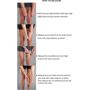— Dica adequada: meça a coxa e a panturrilha 6 polegadas acima e abaixo da rótula usando uma fita métrica flexível. Use o diâmetro que você mede aqui para escolher seu tamanho