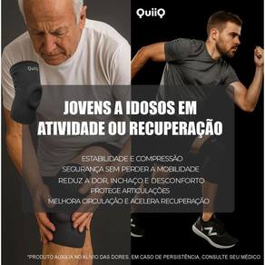 -A Joelheira Ortopédica Esportiva Pró Active da QuiiQ é desenvolvida com tecido tricô 3D de alta tecnologia, oferecendo compressão, estabilidade e conforto.