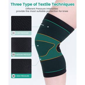- Zoneamento de pressão direcionado: as joelheiras Sportneer empregam técnicas têxteis inovadoras para criar zonas especializadas dentro das joelheiras, aplicando estrategicamente três níveis de pressão para suporte ideal. A pressão mais alta é centrada em torno da patela, seguida por zonas ao redor do joelho e panturrilha, proporcionando compressão sob medida onde é mais necessária para melhorar a estabilidade do joelho
