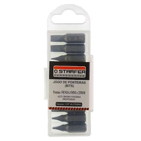 Jogo 10 Bits Ponta Fenda 5mm para Parafusadeira em Aço Cromo Vanádio de Alta Qualidade Este Aço É Para Gerar Uma Resistência Melhor Para As Ferramentas; Para Ou Doméstico; Utilizado Em Parafusadeiras Para Apertar Ou Soltar Parafusos. - Encaixe = 1/4" 6,35mm ; - Comprimento = 25mm. - Modelo da Ponta = Fenda 5mm Ref.: 11065724 Marca: Starfer Marca: Não Informado