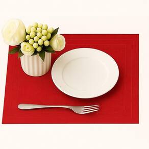 A textura em PVC confere aderência, reduzindo o risco de deslizamento de utensílios durante as refeições. A coloração vermelha, combinada ao design retangular, proporciona um toque visual na composição da mesa, adequando-se a diferentes estilos de decoração. Sua manutenção se resume à limpeza com um pano úmido, dispensando a necessidade de lavagem e facilitando a rotina.