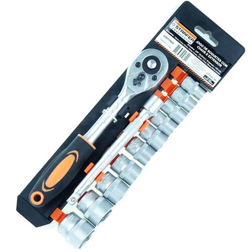 Jogo soquete com chaves e extensor 3/8 12 peças - StarferJogo de soquetes intercambiáveis em Aço Cromo Vanádio de alta qualidade.Este Aço é usado para gerar uma resistência melhor para as ferramentas.Indicado para aperto e desaperto de porcas e parafusos sextavados.Para uso profissional ou doméstico. Composição:- Chave catraca reversível com cabo emborrachado com encaixe de 3/8" (9,53mm);- Extensor com 150mm de comprimento;- Jogo 10 Peças Soquete com encaixes de: 10mm, 11mm, 12mm, 13mm, 14mm, 15mm, 17mm, 19mm, 22mm e 24mm.Especificações Técnicas:Marca: StarferRef.: 3517802Modelo: Catraca 3/8"Material: Aço Inclui estojo: simPeças: 12 peças