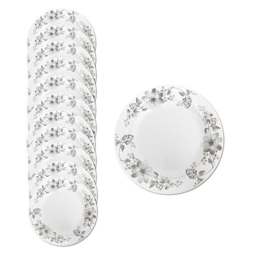 Jogo 12 Prato Raso de Vidro Branco Flores Cinza Flowers Grey 26cm Em Casa Tem