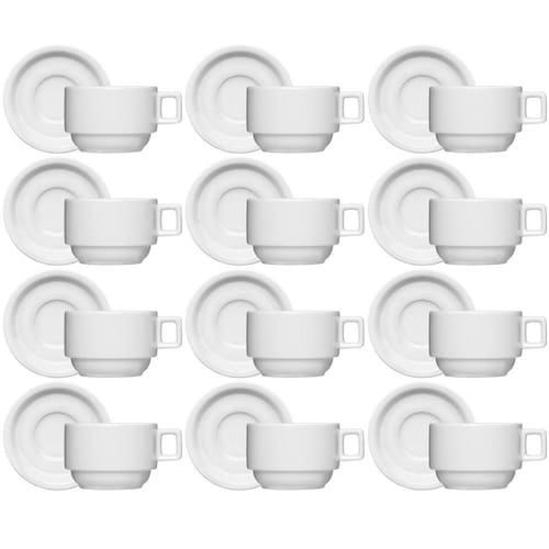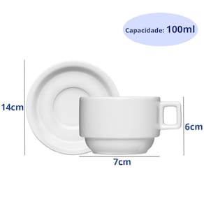 Garantia: 90 dias / Peso: 2,88kg / Cor predominante: branco / Referência: 7891658139340X12 Dimensões de cada xícara: 10cm (C) x 7cm (D) x 5cm (A); Capacidade de cada xícara: 100ml; Diâmetro dos pires: 14cm; Conteúdo: 12 xícaras e 12 pires; Material: porcelana.