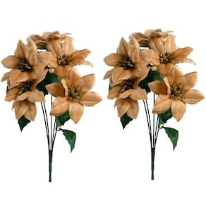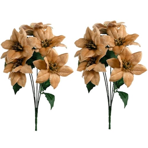 Jogo 2 Buquês Natalino Mini Bico de Papagaio Veludo Champanhe com 5 Flores – 30cm