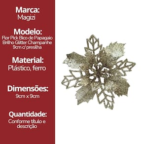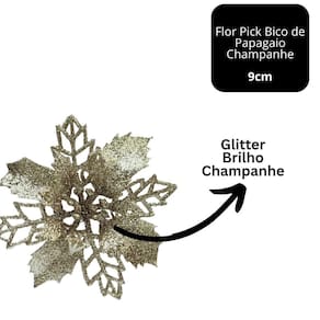 Adicione um toque de brilho e sofisticação à sua decoração natalina com este jogo com 2 flores bico de papagaio modelo pick. Com acabamento em glitter champanhe e design delicado, são perfeitas para realçar guirlandas, arranjos florais, árvores de Natal, embrulhos especiais ou qualquer composição decorativa temática.