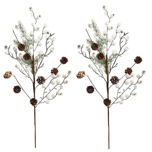 Jogo 2 Galhos Decor Natalino Nevado Rústico com Berries Brancas e 8 Mini Pinhas – 62cm