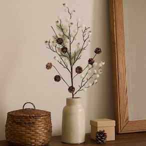 Crie uma decoração natalina encantadora com o Galho Nevado Rústico com Berries Brancas e 8 Mini Pinhas. Com visual natural e acabamento com efeito de neve, é perfeito para arranjos de mesa, vasos decorativos, guirlandas ou para complementar a árvore de Natal.