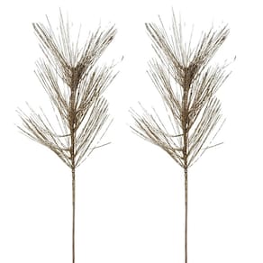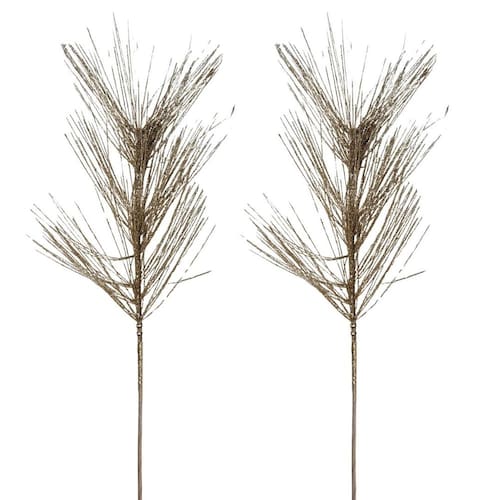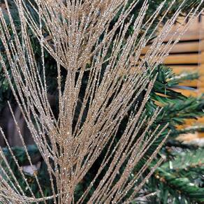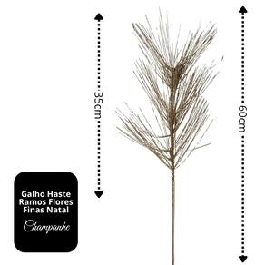 O galho possui flores decorativas longas e finas com 35cm de comprimento, conferindo leveza e movimento visual ao arranjo. A coloração champanhe com brilho sutil proporciona um efeito moderno e ao mesmo tempo tradicional, ideal para decorações natalinas mais refinadas.