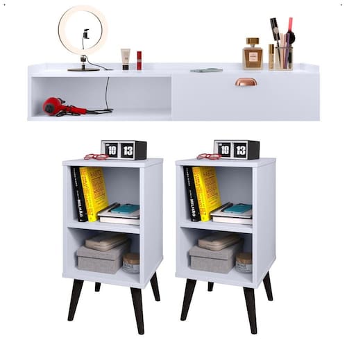 Já a Penteadeira Suspensa Decor otimiza o ambiente sem ocupar espaço no chão, ideal para quartos compactos. Conta com porta e tampo espaçoso, oferecendo espaço perfeito para organizar maquiagens, perfumes e outros acessórios de forma prática e discreta.