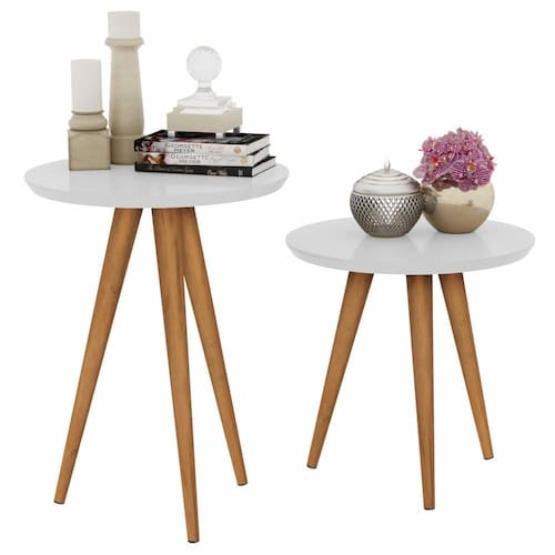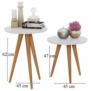 Jogo 2 Mesas Retrô Pés Palito, Lateral E Apoio - Branco Jogo de 2 mesas lateral e apoio, é vendido pela comprar móveis em casa, oferece um ambiente sofisticado de alta qualidade e acabamento para sua sala. Dimensões do produto montado: Mesa lateral: Altura: 47 cm Largura: 45 cm Profundidade: 45 cm Mesa apoio: Altura: 62 cm Largura: 45 cm Profundidade: 45 cm Observações: - estilo retrô; - produzida em mdf de 15mm; - pé de madeira maciça Pintura: Produto com pintura ultravioleta, maior resistência e durabilidade, além de proporcionar um acabamento perfeito para o produto. Instruções de uso e manutenção: Limpar apenas com pano levemente umedecido com água Montagem: Este produto acompanha manual de instrução detalhando passo a passo de como montar. A montagem do produto é de fácil entendimento, mas não deixamos de ressaltar que a mesma deverá ser feita por um profissional, para que não ocorram danos no produto. Atenção: a montagem não é oferecida pela comprar moveis em casa, a montagem do produto é por conta do comprador. Fotos meramente ilustrativas não acompanham os produtos de decoração. Observações importantes: O produto é lacrado e novo com embalagem . A é de 60 dias por defeitos de fabricação. Em caso de erro de montagem, uso inadequado do produto, ou outros acidentes do gênero esta não será acionada. Se por eventuais circunstâncias o produto apresentar defeitos de fabricação, o cliente deverá imediatamente entrar em contanto conosco com o manual de montagens em mãos e com o numero da peça que venha estar que sofreu danos. A comprar moveis em casa ira imediatamente providenciar uma nova peça o mais rápido possível. Se no ato de recebimento do produto o cliente verificar que o produto não está em prefeito estado, principalmente por ocasião de transporte irregular, o cliente deverá recusar o recebimento do produto e entrar em contato para resolver o problema. Todo produto estará acompanhado de um manual de instrução para a montagem do produto. As imagens são meramente ilustrativas Os produtos não são acompanhados de produtos de decoração vasos, revistas, etc. .