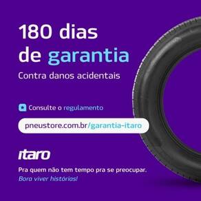 A Garantia Especial Itaro foi pensada para que você possa rodar com segurança e tranquilidade, com os pneus nascidos para contar histórias. São 180 dias contra Danos Acidentais, que impossibilitem o pneu de ser reparado. Ou seja, em casos de pequenas avarias, em que há conserto constatado por um profissional indicado pela PneuStore, a troca não é aplicada. Consulte o regulamento completo acessando a nossa página de garantias: Garantia Especial Itaro Ean: 6950306337864