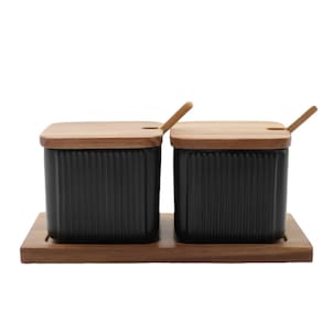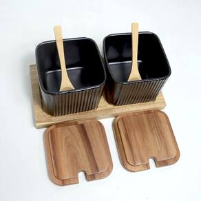 Itens da embalagem: 1 suporte em bambu 2 potes em cerâmica 2 colheres em bambu