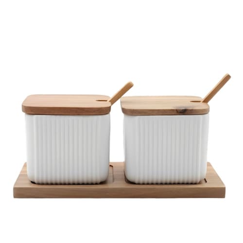Jogo 2 Porta Condimentos em Cerâmica Com Tampa De Bambu