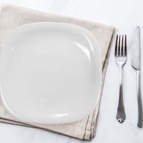 O prato raso branco quadrado Square, com 25,5cm, é produzido em vidro opalino, um material conhecido por sua resistência e aparência à porcelana.