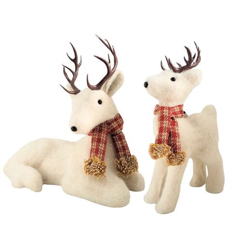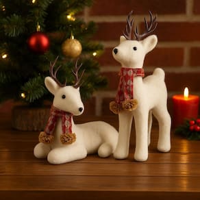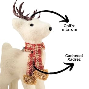 Transforme sua decoração natalina com o charme do conjunto de 2 renas em pelúcia creme, composto por um modelo em pé (24x12cm) e outro deitado (23x20cm). Ambos acompanham cachecol xadrez vermelho e marrom, que trazem um toque rústico e acolhedor para o ambiente.