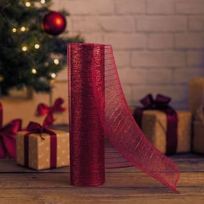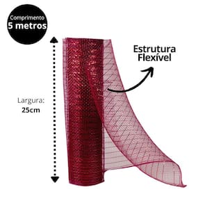 Com 25cm de largura e 5 metros de comprimento por rolo, esta tela pode ser utilizada para decorar árvores de Natal, moldar laços em guirlandas, arranjos de mesa, embalagens de presentes e enfeites variados. Sua estrutura flexível e maleável facilita o manuseio, permitindo criar formas criativas com praticidade.