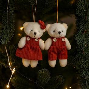 Adicione charme e aconchego à sua decoração natalina com este jogo de 2 ursinhos decorativos em pelúcia creme, representando um casal vestido com roupas em veludo canelado na cor terracota. Cada ursinho possui cordão para pendurar, ideal para enfeitar árvores de Natal, guirlandas, festões ou composições decorativas em diversos ambientes.