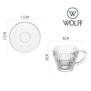 Xícara de café da marca Wolff, pertencente à linha Império. A peça é produzida em cristal e possui capacidade para 110ml. Um detalhe característico é o acabamento com fio de ouro na borda. Este item é destinado ao consumo de café e bebidas similares.