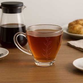 A xícara de chá de vidro da marca Em Casa Tem combina elegância e funcionalidade em um design delicado com capacidade para 220ml. Produzida em vidro transparente de alta qualidade, ela apresenta um acabamento texturizado com relevo em forma de ramos e folhas, oferecendo um toque decorativo e sofisticado à peça sem comprometer sua leveza visual.