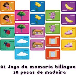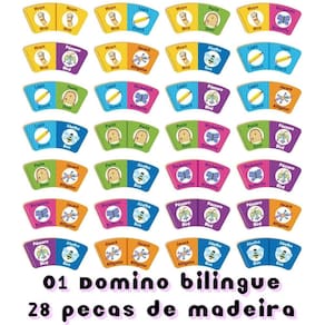 Conteúdo da Embalagem: 01 jogo de memoria Bilíngue com 20 peças e 01 jogo de domino bilíngue com 28 peças