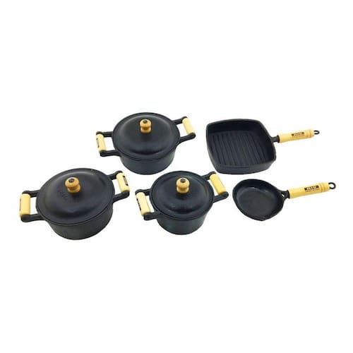 Jogo com 5 peças de ferro fundido, sendo 03 Panelas caçarola alça de Madeira com tampa,