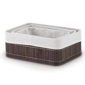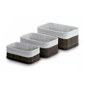 Jogo 3 Cestos Organizadores de Bambu Escuro Conjunto com 3 Cestos Multiuso em Bambu Forrado em tecido de algodão, perfeitos para serem usados como caixas organizadoras que decoram organizando sua casa. Pode ser usando onde sua necessidade permitir, lavabo, banheiros, cozinha, quarto, closet, etc.