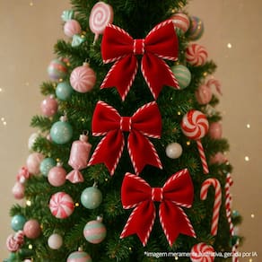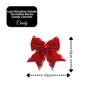 Os laços são confeccionados em tecido veludo de alta qualidade, com acabamento listrado nas bordas em estilo Candy Christmas (vermelho e branco), trazendo brilho e delicadeza na medida certa. A fixação é prática, com arame revestido que permite ajustar e moldar facilmente conforme a sua decoração.
