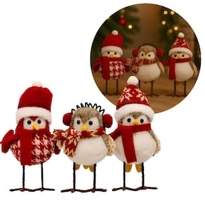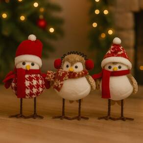 Traga o charme e a ternura do Natal para sua decoração com este encantador jogo com 3 passarinhos natalinos em pelúcia. Cada peça é ricamente detalhada com roupinhas em tricô vermelho e branco, gorrinhos fofos, cachecóis estilosos e protetores de ouvido, criando um visual acolhedor e festivo.