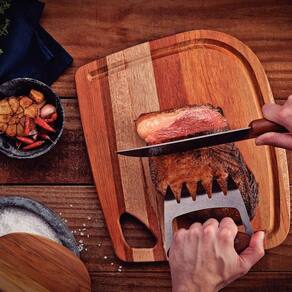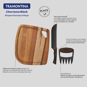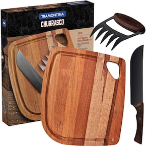 - Melhor conforto ao preparar seu churrasco com a garra para apoiar a carne enquanto corta. - Tábua em Madeira para uma melhor qualidade e eficiência. - Faca com cabos de Madeira para maior conforto e lâminas em Aço Inox, mantendo a excelente qualidade Tramontina.