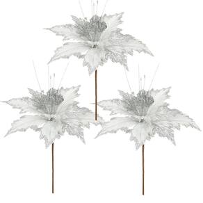 Com 25cm de altura x 16cm de largura, o pick é ideal para compor árvores de Natal, guirlandas, arranjos, vasos ou centros de mesa, garantindo destaque e elegância. Seu design delicado com pétalas decoradas em glitter cria um efeito visual encantador, perfeito para quem busca uma decoração refinada.