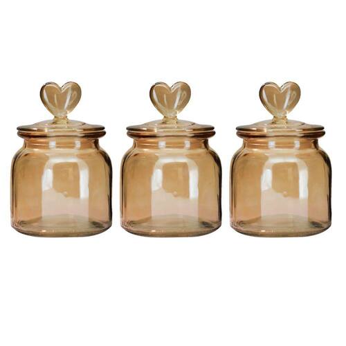 Não perca mais tempo, adquira agora mesmo o nosso Jogo de Potes em vidro âmbar modelo Afeto com tampa decor coração e desfrute de alimentos frescos e bem armazenados em sua cozinha!