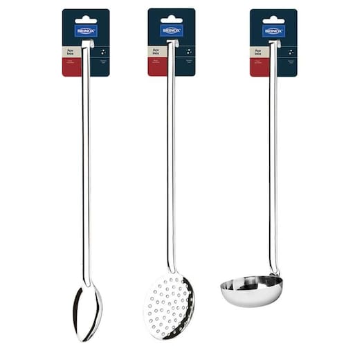 Conteúdo: 1 colher para servir arroz, 1 concha para molho e 1 escumadeira para fritura;
