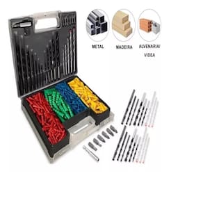 Jogo de Brocas, Bits e Buchas com 300 PeçasEste conjunto é ideal para quem realiza projetos domésticos e hobbies que exigem precisão e variedade. Com um kit completo de brocas, bits e buchas, este jogo traz as medidas mais comuns, ideais para perfurações em concreto, metal e madeira, proporcionando uma solução prática e organizada para diversas necessidades.Descrição do Produto:Brocas para Concreto: Produzidas em aço carbono com placa de metal duro (material VK8), perfeitas para perfurações em superfícies resistentes.Brocas para Metal: Feitas em aço rápido (HSS), garantindo alta durabilidade e precisão para perfurar metais.Brocas para Madeira: Fabricadas em aço carbono, especialmente desenvolvidas para madeira, proporcionando cortes limpos e precisos.Bits: Construídos em aço cromo vanádio, conhecido por sua resistência e durabilidade, ideal para trabalhos contínuos.Itens Inclusos no Jogo:Brocas para Concreto: 5 peças (4, 5, 6, 8 e 10 mm)Brocas para Metal: 7 peças (2, 3, 4, 5, 6, 8 e 10 mm)Brocas para Madeira: 5 peças (4, 5, 6, 8 e 10 mm)Adaptador Magnético: 1 unidade para troca rápida de bitsBits: 2 unidades de fenda e 4 unidades PhillipsBuchas:125 unidades de 5 mm94 unidades de 6 mm48 unidades de 8 mm24 unidades de 10 mmEmbalagem: Todos os itens são organizados em uma caixa de plástico resistente, ideal para transportar e armazenar com segurança, mantendo as peças sempre ao seu alcance.Versatilidade e Praticidade: Com 300 peças, este kit é perfeito para reparos, montagens e instalações, sendo um aliado essencial para projetos no dia a dia. Robustez e qualidade em um conjunto multifuncional para facilitar suas atividades!