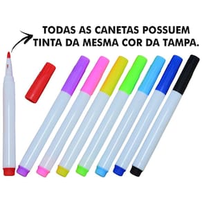 32 Canetas Coloridas para Quadro Branco 12cm Cor: Colorido Todas as canetas possuem a tinta da mesma cor da tampa, para apagar é necessário utilizar apenas um pano ou apagador para quadro branco. Contém: 32 Caneta para quadro branco 12x1cm nas cores: vermelho, lilas, rosa, amarelo, verde, azul claro, azul escuro e preto 4 canetas de cada cor .