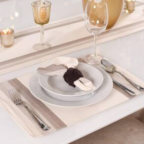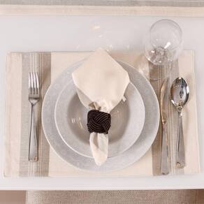 A Linha de Jogo Americanos Fio Tinto possui um design elegante e charmoso com cores neutras e delicadas que dão um toque especial na mesa. Ele é versátil e combina com diversos tipos de ocasiões e compondo diferentes tipos de mesa. Desenvolvido em tecido 100% algodão, fio tinto e acabamento premium esse lindo jogo americano alia perfeitamente qualidade e beleza. Complete o visual da sua mesa com a linha de guardanapo e trilhos de mesa!