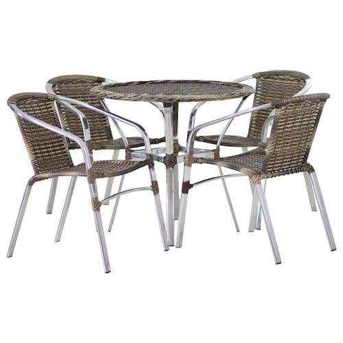 Jogo 4 Cadeiras em Alumínio e Mesa com Tampo Tramado revestida na Fibra Sintética, design sofisticado, leve, durável e resistente ao tempo.