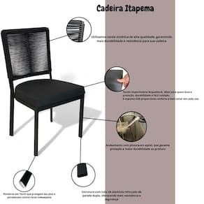 Ela é produzida em alumínio tubo oblongo com reforços interno, pintada com pintura eletro estática (epóxi) de alta qualidade e revestida com corda sintética (Coex) com proteção UV, no assento é uma madeira de mdf de 15 mm, com espuma densidade D28 e revestido de tecido acquablock (Karsten) impermeável, nos pés são utilizado sapatinha de tecnil nylon que não danifica seu porcelanato e tem uma resistência maior a piso ásperos.