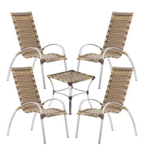 Jogo 4 Cadeiras E Mesa Garden Alumínio Para área Trama Capuccino Jogo 4 Cadeiras e Mesa Garden Aluminio Para Area, Piscina, Jardim Trama A empresa e pioneira no ramo de vendas e-commerce de moveis artesanais, ha mais de 15 anos no mercado, focada na qualidade, garante uma excelente experiencia aos seus clientes. Atentos as tendencias, busca sempre a inovacao e variedade dos seus produtos. Ao adquirir qualquer um de nossos moveis, estara adquirindo confianca, credibilidade, conforto e comprometimento, equilibrando qualidade e preco justo!