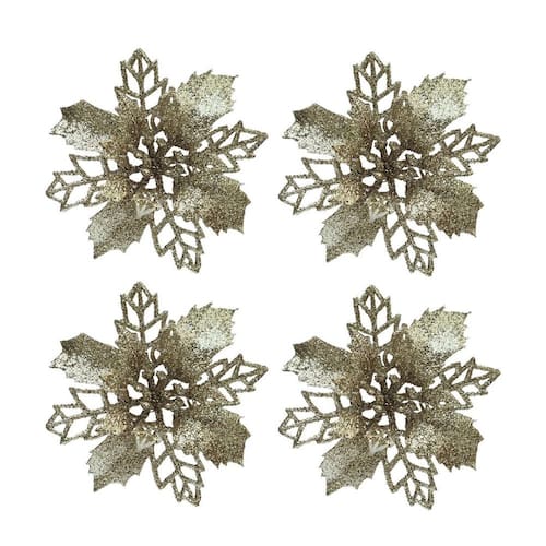 Adicione um toque de brilho e sofisticação à sua decoração natalina com este jogo com 4 flores bico de papagaio modelo pick. Com acabamento em glitter champanhe e design delicado, são perfeitas para realçar guirlandas, arranjos florais, árvores de Natal, embrulhos especiais ou qualquer composição decorativa temática.