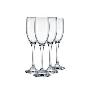 Jogo com 4 taças Imperatriz Nadir, em vidro cristalino, no modelo flute, que favorece a formação de bolhas e direciona o aroma da bebida para o nariz, sendo ideal para espumantes.