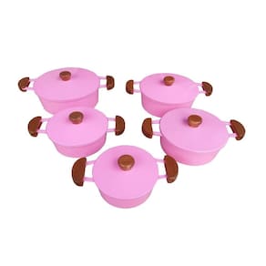 Mais luxo e requinte para sua cozinha, jogo com 5 peças de alumínio fundido com tampa pesada na linda cor Rosa Bebê, são 3 camadas de tinta e verniz para maior brilho e durabilidade.