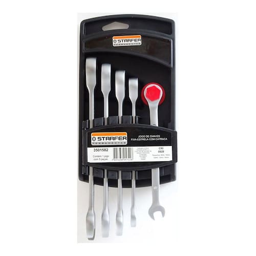 Jogo de chave fixaestrela com catraca com 5 peças. Ótima Resistência, Fabricada com Aço Carbono Forjado, Pode ser utilizada para Serviços Profissionais, e Domésticos Tamanhos: 8/ 10/ 12/ 13 e 14 mm Incluso Suporte Plátisco Marca Starfer Linha Profissional Ref: 03501582 Marca: Starfer Ean: 7891638057428
