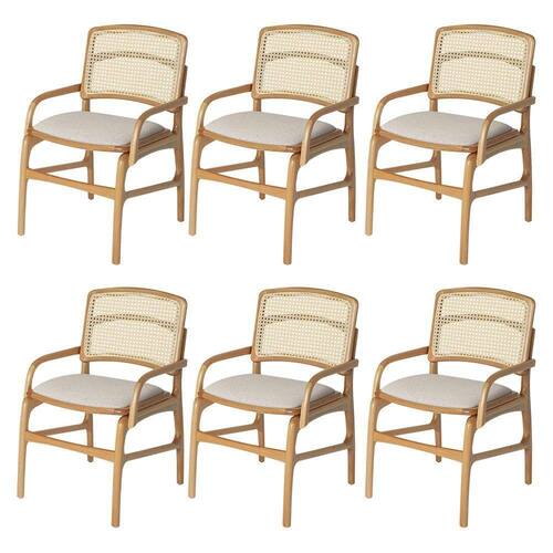 AS IMAGENS SÃO MERAMENTE ILUSTRATIVAS E PODEM SOFRER VARIAÇÕES DE COR E PEQUENOS DETALHES DE ACORDO COM O SEU MONITOR, ILUMINAÇÃO DO AMBIENTE E ATÉ MESMO A SUA PERCEPÇÃO VISUAL.Jogo 6 Cadeiras de Jantar FlorenÃa Estrutura em Madeira Jequitibà Natural BraÃo Encosto Palha Linho Bege